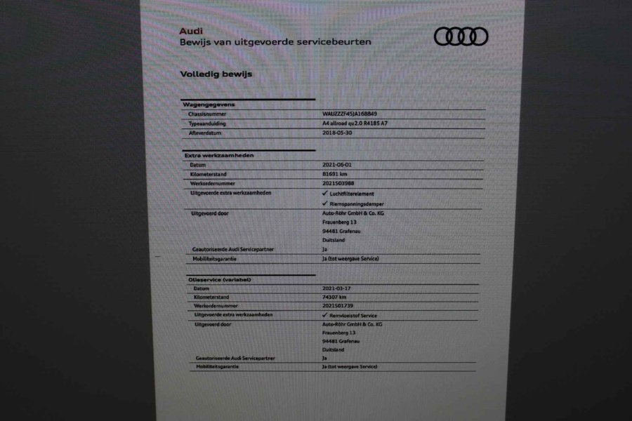 Audi A4 Allroad met benzine (Mild Hybrid) motor die 252pk levert! Samen met de Quattro vierwielaandrijving aandrijving een genot om mee te rijden. Autobedrijf de Baaij is het adres voor alle merken auto’s en is BOVAG Autobedrijf van het jaar 2016-2017! Ook nieuwsgierig naar deze auto? Wij ontvangen u graag op de Aldenhof 1101 in Nijmegen voor een kennismaking en een proefrit. Koffie, cappuccino of latte macchiato? Dit zijn de zekerheden van Autobedrijf de Baaij: - Altijd Bovag garantie, Al onze occasions worden afgeleverd inclusief BOVAG-garantie, nieuwe APK en een onderhoudsbeurt volgens garagehistorie. - Altijd Bovag omruilgarantie, Wanneer u bij Autobedrijf De Baaij een occasion koopt, heeft u altijd recht op BOVAG omruilgarantie. Een ontevreden klant mag de auto binnen twee weken en max. 750 kilometer omruilen. - Altijd All-in prijzen, Wij adverteren met all-in prijzen en rekenen géén kosten rijklaar maken, u weet dus direct waar u aan toe bent en geen addertjes onder het gras in de vorm van bijkomende kosten als rijklaar maken. Alle auto's worden afgeleverd met een nieuwe APK en een onderhoudsbeurt. Heeft u niet gevonden wat u zocht? Wij zoeken graag met u mee! Eventuele navigatie updates zijn tegen meerprijs leverbaar. Proefrit en Aflevering op locatie? Wij rijden op de afgesproken tijd deze occasion naar uw huisadres. Daar start uw proefrit. Om te zorgen dat de proefritten vlekkeloos verlopen en om eventuele zorgen bij de potentiële autokopers weg te nemen, hebben we extra beschermende maatregelen genomen en een aantal voorwaarden opgesteld: • Proefritten zijn in een straal van 50 km vanaf het autobedrijf. • Bij contact tussen het autobedrijf en klanten worden de richtlijnen van het RIVM in acht genomen. • Het dashboard, handrem, handgrepen etc. reinigen voor en na de proefrit met desinfecterend schoonmaakmiddel • Het beschikbaar stellen van handschoenen • Beschermhoezen over stoelen en stuur • De proefrit duurt maximaal 30 minuten. • De standaardregels bij proefritten van het autobedrijf blijven van kracht. Voor het maken van een kopie van het identiteitsbewijs kun je gebruik maken van de KopieID app. • De medewerker van het autobedrijf wacht buiten bij de locatie van de klant.