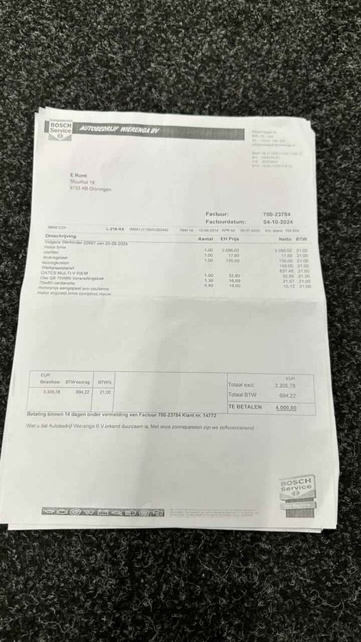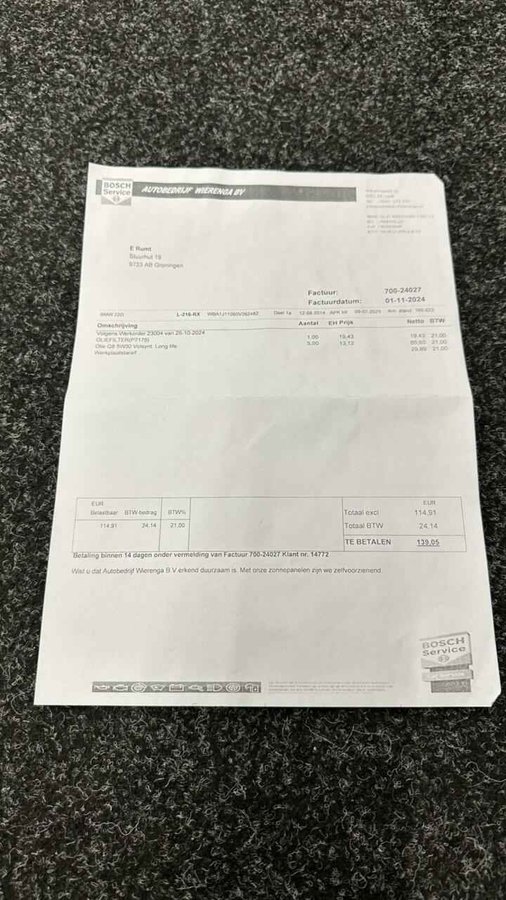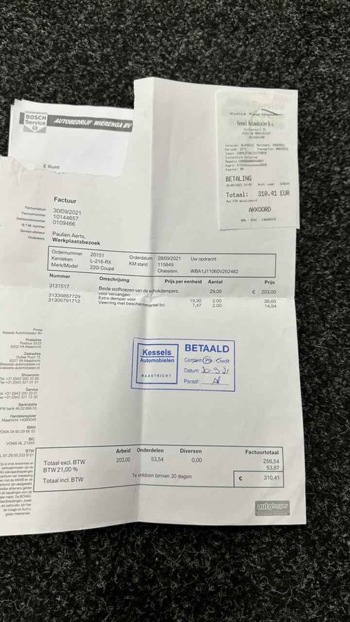 BMW 2-serie Coupé 220i High Executive|Alcantara|Airco|Cruise|M-Sport| - Kenteken: L-216-RX - Merk: BMW - Model: 2-serie Coupé - APK tot: 07-03-2026 - Tellerstand: 171629 KM - Carrosserievorm: Coupé - Aantal deuren: 2 - Brandstofsoort: Benzine - Bouwjaar: 2014 - Transmissie: Handgeschakeld - Kleur: rood - Bekleding: Leder/Stof - Kleur interieur: zwart - Motorinhoud: 1997 cc - Aantal cilinders: 4 - Motorcode: N20B20B - Vermogen: 135 kW / 184pk - Ledig gewicht: 1325 kg - Max. trekgewicht: 1200 kg - Aantal zitplaatsen: 4 - Verbruik: 6.3 l/100 km - BTW/Marge: Marge, de BTW is niet aftrekbaar - Lengte: 443 cm - Breedte: 177 cm - Hoogte: 1418 cm - Aantal sleutels: 2 - Onderhoudshistorie aanwezig: Ja - Motorrijtuigenbelasting: € 190 - 207 per kwartaal - Emissieklasse: Euro 6 Pakket: M Sportpakket - Sportonderstel - Sportstoelen Pakket: Sport Line - Sportstoelen Comfort - Boordcomputer - Cruise control - Regensensor Exterieur - Buitenspiegels elektrisch verstelbaar - Buitenspiegels verwarmbaar - Centrale vergrendeling met afstandsbediening - Dimlichten automatisch - Lichtmetalen velgen 16" - Lichtmetalen velgen 18" - Metaalkleur - Mistlampen voor - Park Distance Control - Parkeersensor achter - Ruitensproeiers/wisserbladen verwarmbaar - Sportonderstel - Sportvelgen Infotainment - Audioinstallatie met CD-speler - Multimedia-voorbereiding - Spraakbediening - Stuur multifunctioneel Interieur - Achterbank in delen neerklapbaar - Airco - Aluminium interieur afwerking - Armsteun voor - Buitentemperatuurmeter - Elektrische ramen voor - Microvezel bekleding - Middenarmsteun voor - Sportstoelen - Sportstuur - Stuur leder - Stuurbekrachtiging Milieu - Start/stop systeem Overige - Anti Blokkeer Systeem - Anti doorSlip Regeling - Bestuurdersairbag - Bluetooth - Bots herkenning en activatie - Elektronisch Stabiliteits Programma - Passagiersairbag - Zij airbag(s) voor Veiligheid - Alarm klasse 1(startblokkering) - Bandenspanningscontrolesysteem - Isofix bevestiging voor kinderzitjes Ontspannen en zorgeloos autorijden, dat doet u met deze BMW 2-serie Coupé. De aandrijving van deze BMW wordt verzorgd door een viercilinder benzinemotor en een handgeschakelde versnellingsbak. De sportstoelen geven u veel zitsteun. Bij de uitrusting van deze auto horen onder meer 18 inch lichtmetalen velgen, sport line onderstel, in delen neerklapbare achterbank, elektrisch bedienbare en verwarmde buitenspiegels, elektrisch bedienbare ramen voor en metallic lak. De bediening van het audio-installatiesysteem gebeurt met knoppen op het stuur en als u wilt zelfs met uw stem. Met de aanwezige parkeersensoren weet u altijd zeker of het past. Natuurlijk is een complete auto als deze ook voorzien van sensoren die de omgeving in de gaten houden. Deze BMW heeft niet alleen een automatisch inschakelbare verlichting aan boord, maar ook een regensensor. Ook op de korte stukken is de cruise control een uitkomst. Kijk maar bij de benzinepomp! Met de aanwezige airconditioning bepaalt u zelf het binnenklimaat. Ook sportstuurwiel, buitentemperatuurmeter, isofix-aansluiting, centrale deurvergrendeling met afstandsbediening en boordcomputer zijn aan boord. Zoals u mag verwachten van deze BMW 2-serie Coupé is hij uitgerust met een reeks aan actieve veiligheidssystemen. Verder is deze auto uitgerust met frontale botsbescherming en bandenspanningcontrolesysteem. Om deze auto zelf te ervaren, hoeft u alleen maar contact met ons op te nemen. Mailt of belt u ons direct? Voor meer vragen of informatie kunt u ons altijd bellen mailen of smsen. Kijk ook eens naar onze andere voordelige advertenties. Onze garantiepakketten Instapgarantie (€399,-) Auto's van 10 - 15 jaar oud en tot 200.000 km. Inclusief onderhoudsbeurt. Excellent garantie (€499,-) Auto's tot 10 jaar oud en tot 200.000 km. Inclusief onderhoudsbeurt. Exclusive garantie (€1499,-) Speciaal voor onze exclusives. Auto's tot 10 jaar oud en tot 200.000 km. Inclusief onderhoudsbeurt. Onze advertenties worden met grote zorgvuldigheid op het internet geplaatst. Mocht er onverhoopt toch een fout in staan, dan kan hieraan geen rechten worden ontleend.  Financiering is mogelijk. Whatsapp ons op:  06-552 318 32 RTO autoservice Zuiderdiep 408 7876 AW Valthermond 0599 72 70 12 info@rtoautoservice.nl www.rtoautoservice.nl/