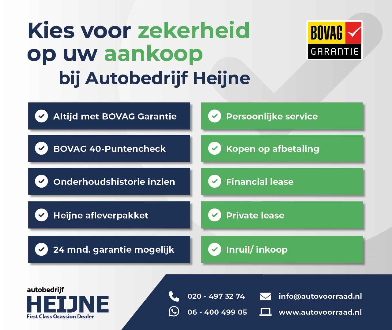 *****Online auto kopen bij autobedrijf Heijne! Auto gevonden? Bel/whatsapp/e-mail/facetime ons. Voor het verkoop gesprek. Bespreek eventuele inruil of mogelijkheden tot financiering. Wanneer gewenst mailen/whatsappen wij meer foto`s of informatie van de auto. Offerte/koopcontract op afstand. Vrijblijvende bezorging van de auto of proefrit aan huis. Tenaamstellling/vrijwaren en (pin)betalingen op locatie.***** Autobedrijf Heijne is een BOVAG occasion dealer met een topselectie jong gebruikte auto`s deze zijn: 100% onderhouden met duidelijke historie, origineel Nederlands, gegarandeerde kilometerstanden, BOVAG garantie en altijd scherp geprijsd. Uw huidige auto ruilen wij graag in! Ook zijn wij gespecialiseerd in het financieren van u nieuwe aankoop dit zowel voor de particuliere klant of Financial-lease voor de (startende) ondernemer en zzp’er. Dit tegen de meest gunstige voorwaardes en laagste rente tarieven. Optioneel kunt u kiezen voor het Heijne Afleverpakket €595-. En ook na aankoop kunnen wij u van dienst blijven zijn in onze eigen werkplaats. Bekijk onze voorraad jong gebruikte auto`s op de website van Autobedrijf Heijne op www.autovoorraad.nl of kom langs voor een bezichtiging in onze showroom in Zwanenburg. Tel 020-4973274 WhatsApp: 0640049905 Mail: info@autovoorraad.nl
