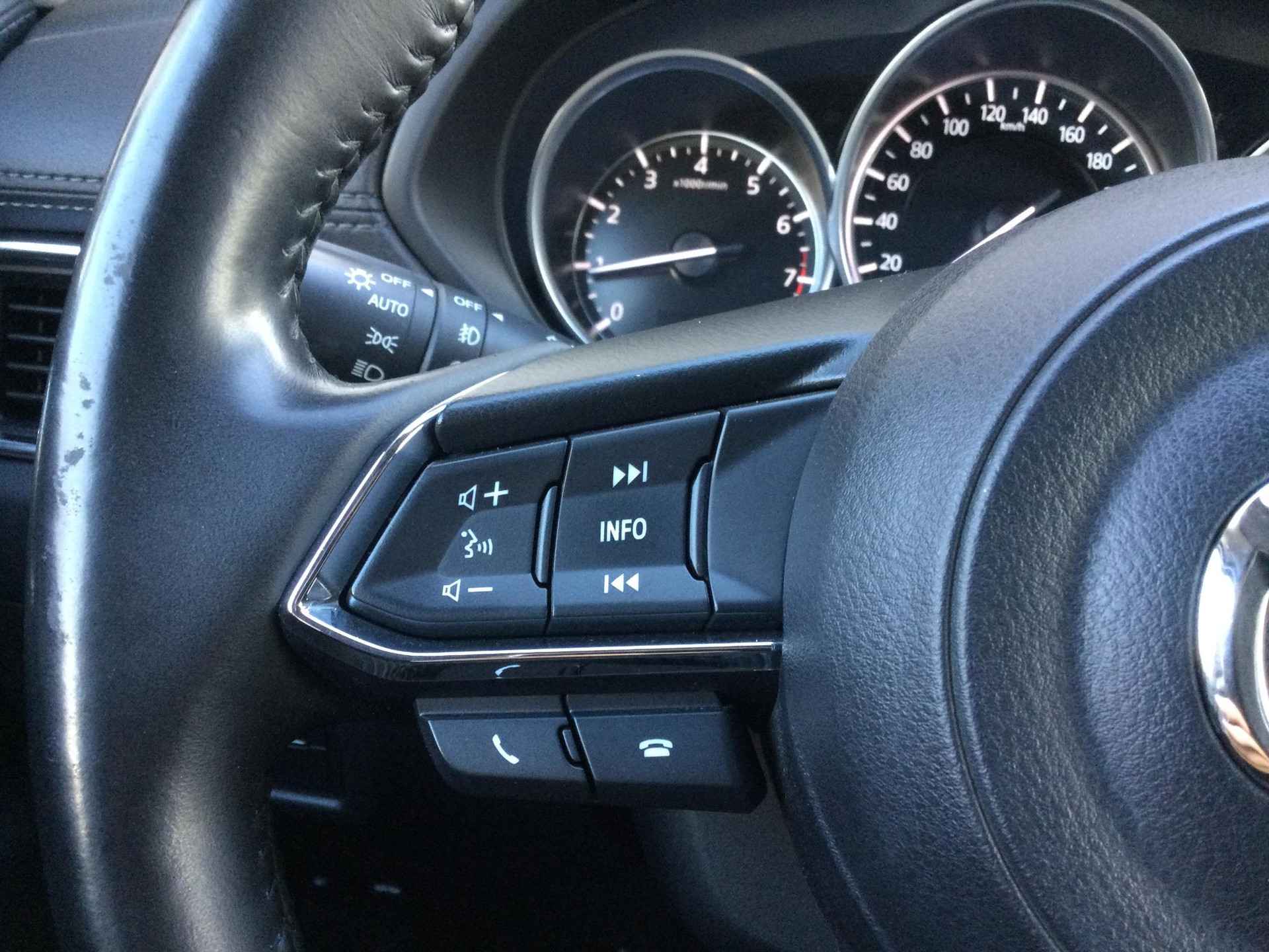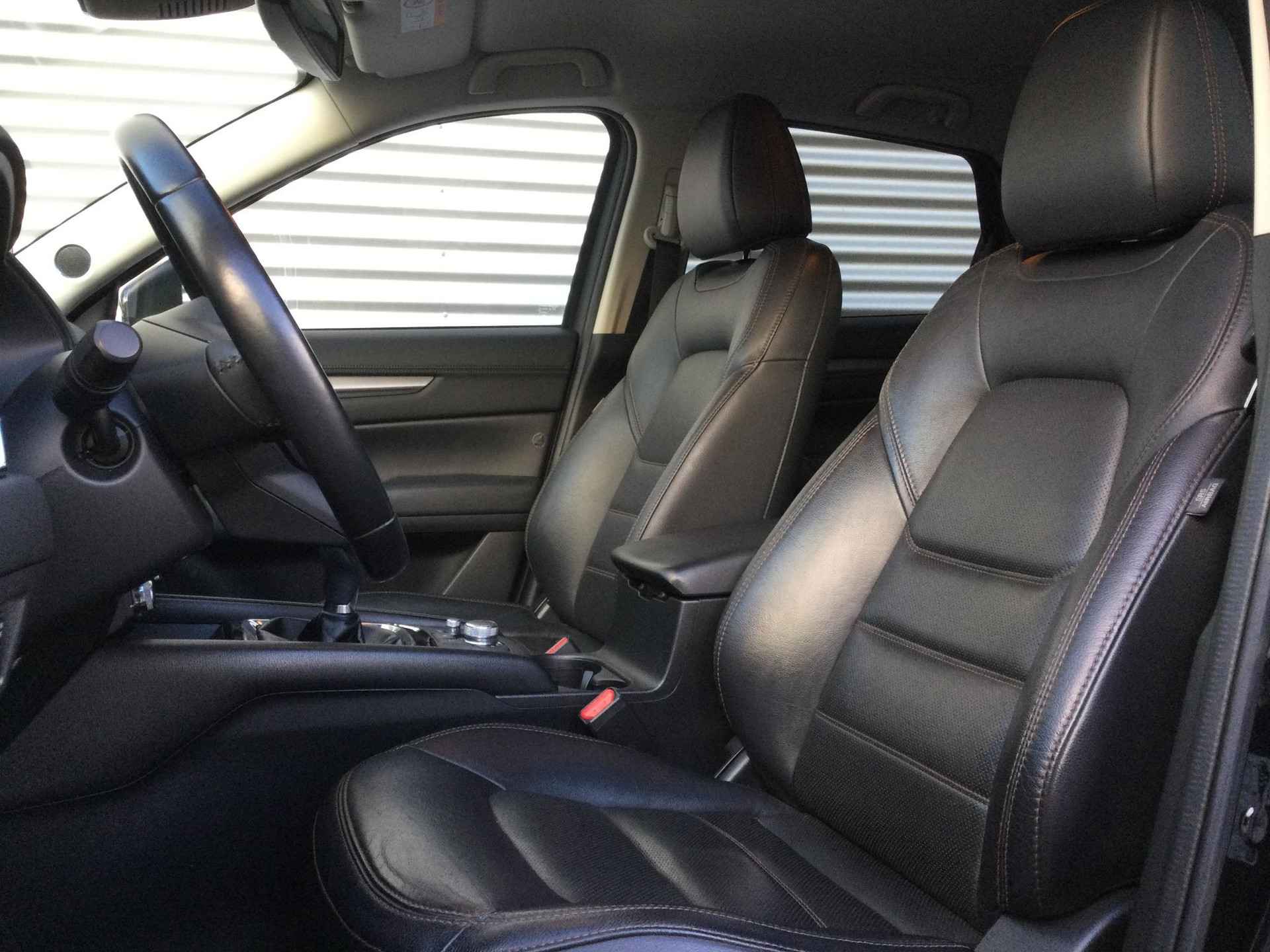 Het zijn de harmonieuze vormgeving en de hoogstaande technologie die de Mazda CX-5 zo begerenswaardig maken. De benzinemotor levert uitstekende prestaties. De stijlvolle, luxe uitstraling is inbegrepen in de vorm van leren bekleding. Winterse omstandigheden? Geniet dan van het comfort van de stoelverwarming! Bij deze Mazda CX-5 is aan alles gedacht, tot en met een verwarmd stuurwiel aan toe. Natuurlijk behoren 17 inch lichtmetalen velgen, LED koplampen, dakspoiler, extra getint glas, in delen neerklapbare achterbank en LED-achterlichten ook tot de uitrusting van deze complete auto. Soms wil je goed geluid kunnen voelen! Het high performance audiosysteem bedient u op uw wenken. Onbedoeld snijden na het inhalen gebeurt niet meer, dankzij de achteropkomend verkeer waarschuwing. Met de electronic climate control selecteert u de gewenste temperatuur. Het systeem doet de rest. De aanwezige parkeersensoren zijn de ultieme hulp om te laten weten hoeveel ruimte er nog is om te manoeuvreren. De auto neemt u werk uit handen doordat hij zelf veel in de gaten houdt. Een regensensor en een automatisch inschakelbare verlichting nemen waar wanneer de ruitenwissers en het licht aan moeten. Deze auto is voorzien van dashboard met spraakbediening, full map navigatiesysteem, DAB ontvangst, cruise control, keyless entry en automatisch dimmende binnenspiegel. In de Mazda CX-5 heeft uw veiligheid en die van uw omgeving prioriteit. Indien u onbedoeld de rijstrook lijkt te verlaten, reageert het Lane-keeping systeem meteen en corrigeert. De forward collision warning reduceert het gevaar van een botsing met een voorligger significant. In deze Mazda vinden we verder een dodehoekdetectie, hill hold functie, brake assist en bandenspanningcontrolesysteem. Hebt u interesse in deze auto? Neem nu contact met ons op en we zetten hem klaar voor een proefrit. Is deze auto iets voor u? Genoemde prijs is een basisprijs. Wij informeren u graag welke garantie en onderhoudspakketten er op deze auto mogelijk zijn, of kijk ook op Knoop-mazda.nl. U bent van harte welkom voor een vrijblijvende nadere kennismaking. Pakket 1:  495,- - 12 maanden wettelijke garantie - Volledig reinigen van in- en exterieur - Voorzien van minimaal 12 maanden APK - Vloeistoffen check Pakket 2:  895,-  - 12 maanden BOVAG garantie - Volledig reinigen van in- en exterieur - Voorzien van minimaal 12 maanden APK - Onderhoudsbeurt volgens schema - Levenslange pechhulp voor jouw Mazda bij onderhoud via de Mazda Dealer  - 20 liter brandstof.  - Napoetsen voor aflevering