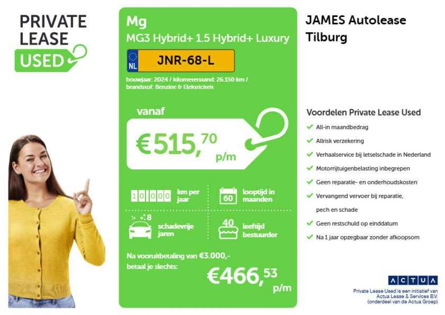 Jouw maandbedrag is afhankelijk van meerdere factoren. Onze vanafprijs is berekend op basis van een van 60 mnd, 10.000km/jr, een vooruitbetaling t.w.v. 3000,- en 8 schadevrije jaren op je autoverzekering. Vraag daarom een offerte aan en ontdek jouw persoonlijke maandbedrag.