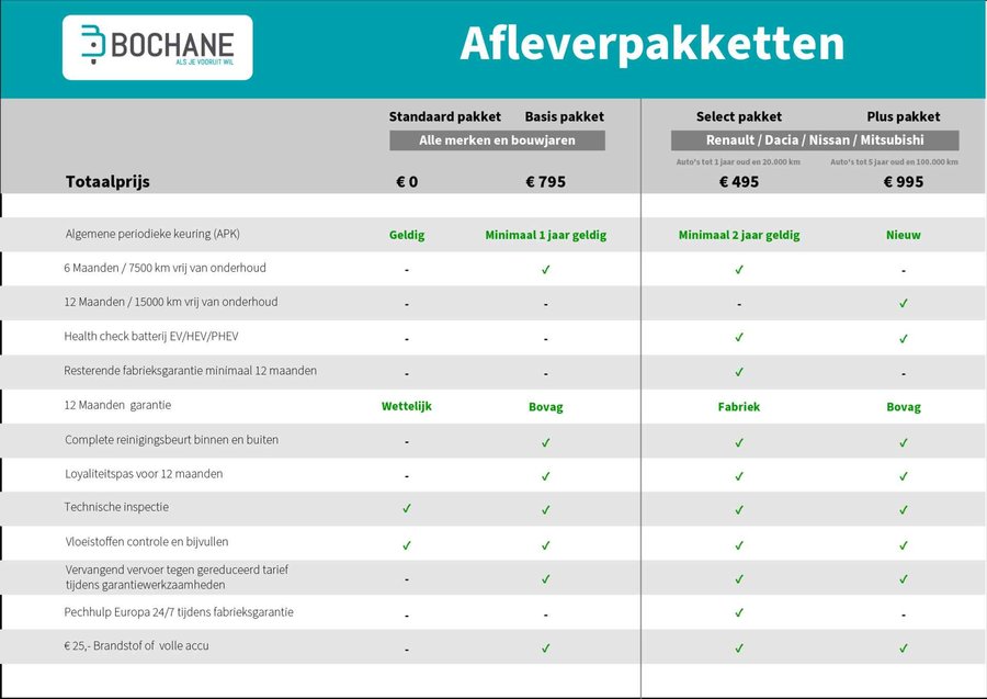 - Minimaal 1 jaar geldige APK - Tenaamstelling van het voertuig - 6 maanden / 7500 KM vrij van onderhoud - Complete reinigingsbeurt binnen en buiten - Technische inspectie - Vloeistoffen controle en bijvullen - Vervangend vervoer tegen gereduceerd tarief tijdens garantie werkzaamheden - € 25,- brandstof of volle accu