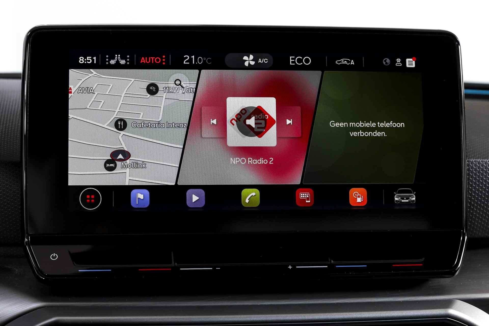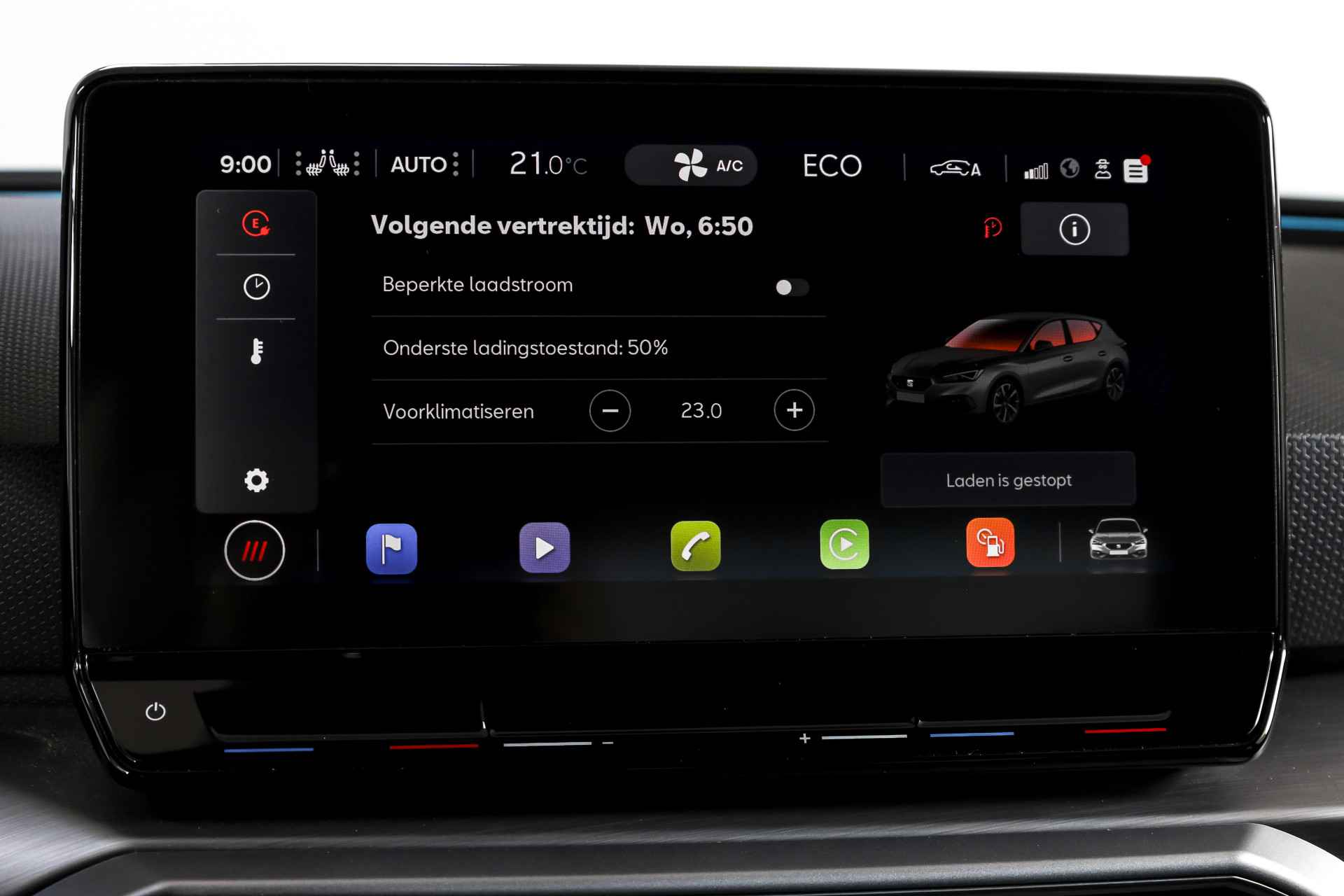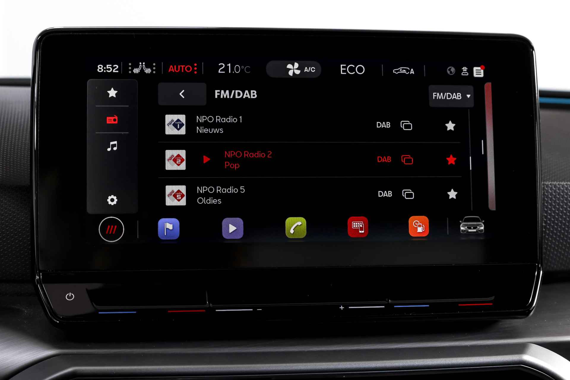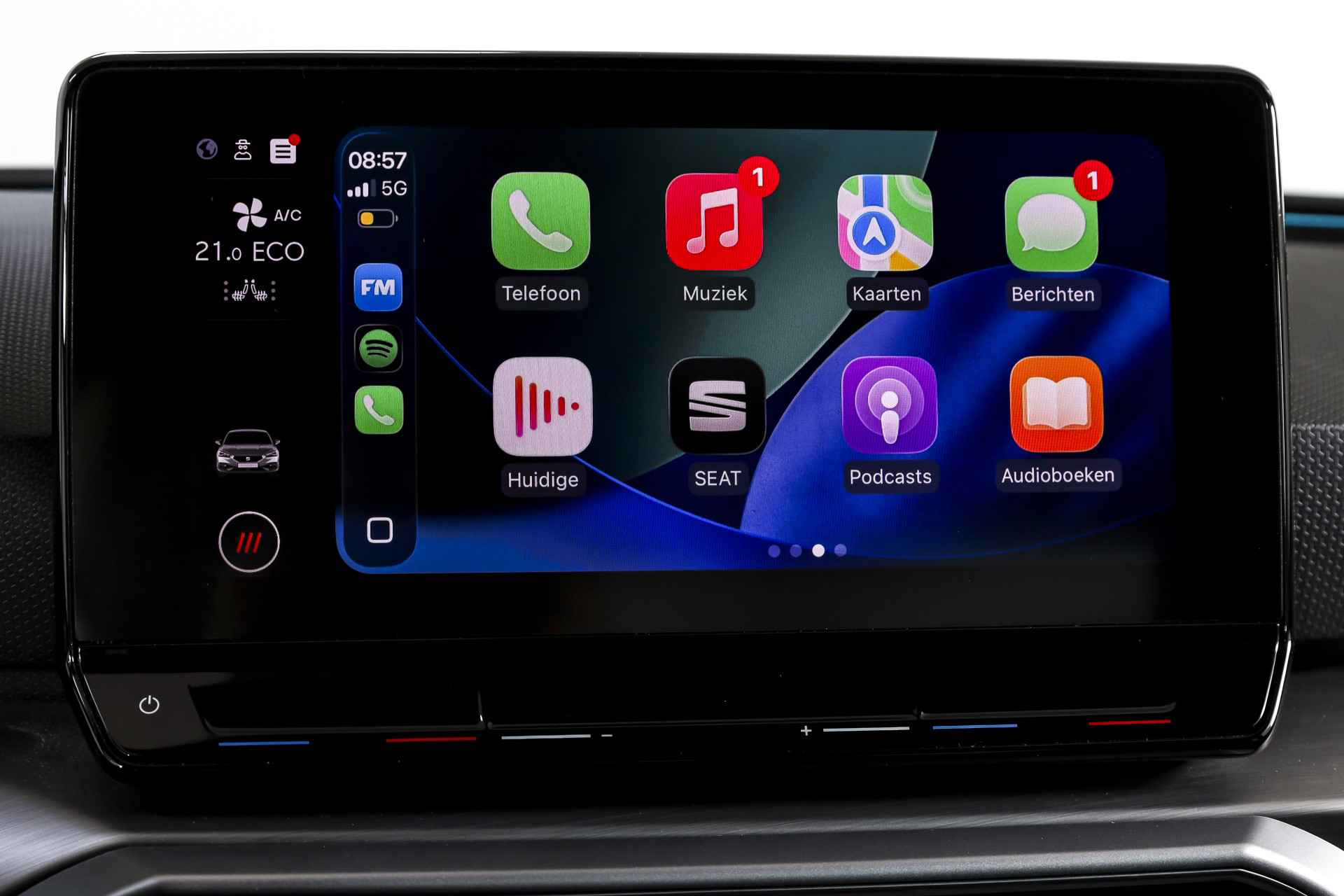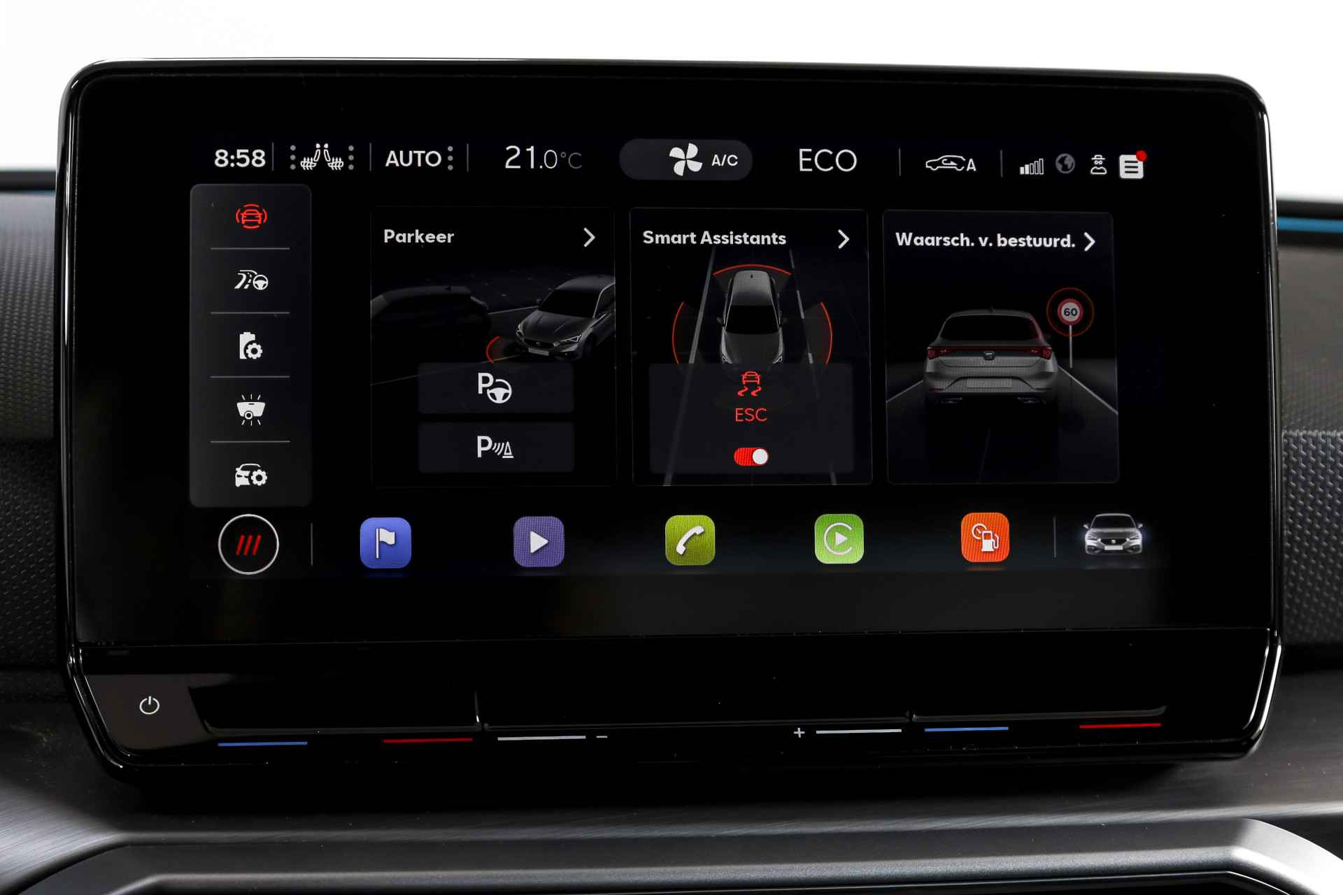 Deze SEAT Leon FR Business Intense uit 2021 combineert sportieve uitstraling met moderne plug-in hybride techniek. Met een systeemvermogen van 204 pk en een automatische transmissie is dit een vlotte, maar ook comfortabele auto voor zowel dagelijks woon-werkverkeer als langere ritten. De kilometerstand bedraagt 84.994 km. Het interieur is overzichtelijk en modern ingericht, met het volledig digitaal instrumentenpaneel als centraal punt. In combinatie met het navigatiesysteem full map en Apple CarPlay/Android Auto zijn bestemmingen en apps altijd binnen handbereik. Dankzij DAB-radio en LED koplampen is ook aan comfort en zicht gedacht, ongeacht het moment van de dag. Qua comfort zit het goed met de airco automatisch, terwijl adaptieve cruise control en vermoeidheidsherkenning bijdragen aan ontspannen en veilige kilometers. Deze Leon is bovendien uitgerust met het Technology Pack, wat betekent dat hij beschikt over een draadloze telefoonlader, een verwarmd stuurwiel en verwarmde voorstoelen – prettig tijdens de koudere maanden. Parkeren en manoeuvreren gaat eenvoudig dankzij de parkeersensoren voor en achter, ondersteund door de achteruitrijcamera en parkeerassistent. Het elektrisch bedienbare glazen schuif-/kanteldak zorgt voor extra licht en een ruimtelijk gevoel in het interieur, terwijl de lichtmetalen velgen 18” de sportieve FR-uitvoering netjes afmaken. Een rijk uitgeruste FR Business Intense, die sportiviteit en comfort op een prettige en evenwichtige manier samenbrengt.