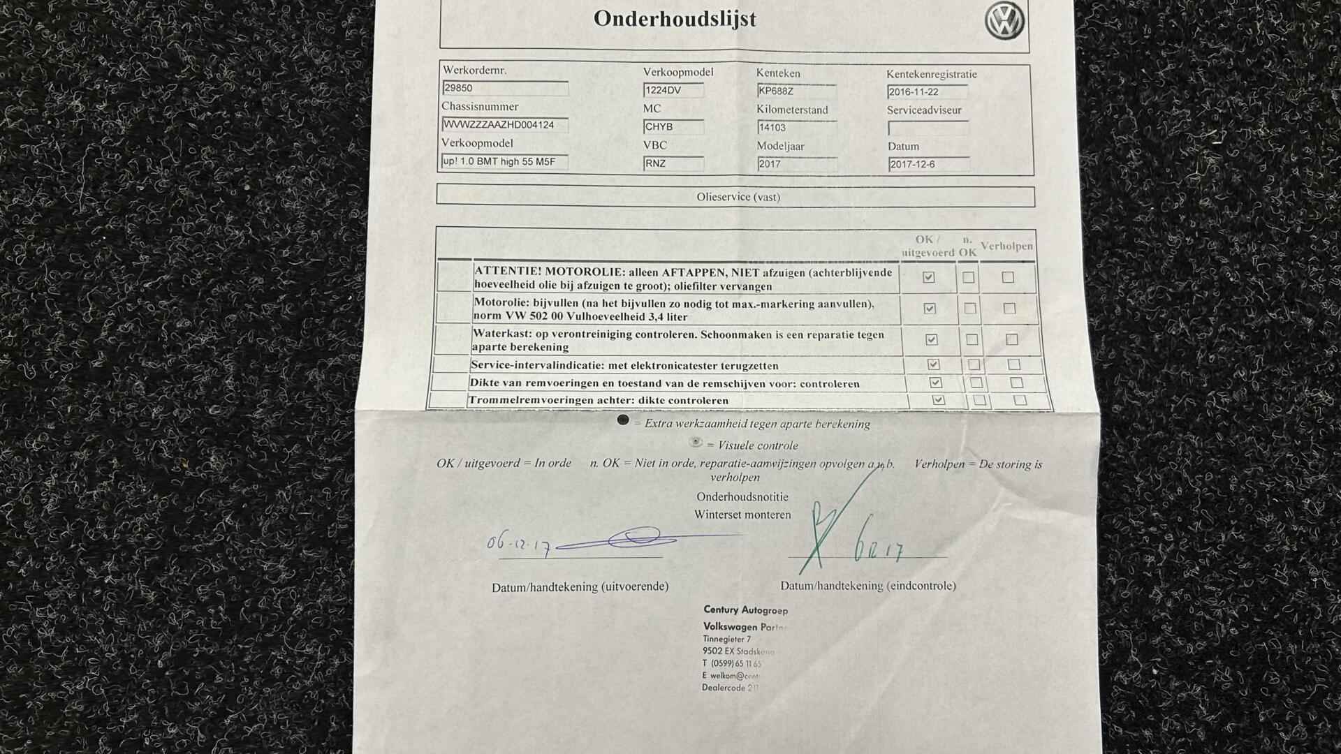 Volkswagen Up! 1.0 BMT high up! ECC LM STOELVERWARMING 5 DEURS. - Kenteken: KP-688-Z - Merk: Volkswagen - Model: Up! - APK tot: 22-11-2026 - Tellerstand: 108914 KM - Carrosserievorm: Hatchback - Aantal deuren: 5 - Brandstofsoort: Benzine - Bouwjaar: 2016 - Transmissie: Handgeschakeld - Kleur: wit - Bekleding: Stof - Motorinhoud: 999 cc - Aantal cilinders: 3 - Motorcode: CHY - Vermogen: 55 kW / 75pk - Ledig gewicht: 836 kg - Aantal zitplaatsen: 4 - Verbruik: 4.1 l/100 km - BTW/Marge: Marge, de BTW is niet aftrekbaar - Lengte: 360 cm - Breedte: 164 cm - Motorrijtuigenbelasting: € 70 - 76 per kwartaal - Emissieklasse: Euro 6 Pakket: Winter pakket 1 - Voorstoelen verwarmd Pakket: Executive pakket - Airco automatisch - DAB - Voorstoelen verwarmd Comfort - Boordcomputer - Cruise control Exterieur - Achterruitwisser - Buitenspiegel rechts - Buitenspiegels elektrisch verstelbaar - Buitenspiegels verwarmbaar - Centrale vergrendeling met afstandsbediening - Dimlichten automatisch - Kleur wit - LED dagrijverlichting - Lichtmetalen velgen 16" - Mistlampen voor adaptief - Park Distance Control - Parkeersensor achter - Sportvelgen - Warmtewerend glas Infotainment - Audio installatie - DAB - Multimedia-voorbereiding - Radio - Smartphone integratie Interieur - Achterbank in delen neerklapbaar - Airco automatisch - Bestuurdersstoel in hoogte verstelbaar - Elektrische ramen voor - Lederen versnellingspook - Microvezel bekleding - Stuur leder - Stuur verstelbaar - Stuurbekrachtiging snelheidsafhankelijk - Voorstoelen verwarmd Milieu - Start/stop systeem Overige - Anti Blokkeer Systeem - Anti doorSlip Regeling - Autonomous Emergency Braking - Bestuurdersairbag - Brake Assist System - Elektronisch Stabiliteits Programma - Elektronische remkrachtverdeling - Hoofd airbag(s) voor - Passagiersairbag - Zij airbag(s) voor Veiligheid - Alarm klasse 1(startblokkering) - Bandenspanningscontrolesysteem - Isofix bevestiging voor kinderzitjes Ze zeggen dat Duitsers weinig humor hebben. Toch geeft deze Volkswagen Up! u absoluut een brede lach op uw gezicht. Kan ook niet anders. Topkwaliteit, vooruitstrevende techniek, formidabele rijsprestaties worden hier gebundeld in één auto. Zoals het een echte Volkswagen betaamt, verkeert deze Up! in uitstekende conditie. De aandrijving van deze Volkswagen wordt verzorgd door een driecilinder benzinemotor en een handgeschakelde versnellingsbak. Doe maar luxe! Neem plaats in de verwarmbare voorstoelen en voel de weldaad in koude dagen. Bij de uitrusting van deze Volkswagen horen onder meer 16 inch lichtmetalen velgen, warmtewerend glas, LED-dagrijverlichting, in delen neerklapbare achterbank en snelheidsafhankelijke stuurbekrachtiging. Wat wilt u onderweg horen? Er is volop keus, dankzij het audio-installatiesysteem met bluetooth en DAB+. Met automatische airconditioning hoeft u alleen de gewenste temperatuur in te stellen. Het systeem doet de rest. Ervaar het comfort van inparkeren met parkeersensoren. Deze auto laat zich moeiteloos in elk parkeervak manoeuvreren. Op een rustige weg komt de cruise control helemaal tot z'n recht. Extra opties op deze auto zijn: lederen stuur, isofix-aansluiting, centrale deurvergrendeling met afstandsbediening, boordcomputer en lederen versnellingspook. Zoals u mag verwachten van deze Volkswagen Up! is hij uitgerust met een reeks aan actieve veiligheidssystemen. In een noodsituatie telt elke meter. Het brake assist systeem van deze auto zorgt ervoor dat uw remweg korter wordt. Indien u interesse heeft in deze Volkswagen, zetten we hem graag klaar voor een proefrit. We horen graag van u, mailt of belt u ons meteen? U kunt deze deze auto financieren vanaf €169,00 per maand. Voor meer vragen of informatie kunt u ons altijd bellen mailen of smsen. Kijk ook eens naar onze andere voordelige advertenties. Onze garantie/rijklaar pakketten Instapgarantie (€399,-) Auto's van 10 - 15 jaar oud en tot 175.000 km. Inclusief: 12 maand garantie. Nieuwe APK. Algehele check. Kleine onderhoudsbeurt. Excellent garantie (€499,-) Auto's tot 10 jaar oud en tot 175.000 km. Inclusief: 12 maand garantie. Nieuwe APK. Algehele check. Kleine onderhoudsbeurt. Excellent plus garantie (€699,-) Auto's tot 10 jaar oud en tot 175.000 km. Inclusief: 12 maand garantie. Nieuwe APK. Algehele check. Grote onderhoudsbeurt. Exclusive garantie (€1499,-) Speciaal voor onze exclusives. Auto's tot 10 jaar oud en tot 175.000 km. Inclusief: 12 maand garantie Nieuwe APK. Algehele check Inclusief onderhoudsbeurt. Onze advertenties worden met grote zorgvuldigheid op het internet geplaatst. Mocht er onverhoopt toch een fout in staan, dan kan hieraan geen rechten worden ontleend.  Financiering is mogelijk. Whatsapp nummer voor:  RTO Autoservice Stadskanaal 06-11 86 66 32 Whatsapp nummer voor: RTO Exclusive 06- 25 37 00 90 RTO Autoservice Stadskanaal Veenstraat 3 9502EZ Stadskanaal 0599727012 stadskanaal@rtoautoservice.nl www.rtoautoservice.nl
