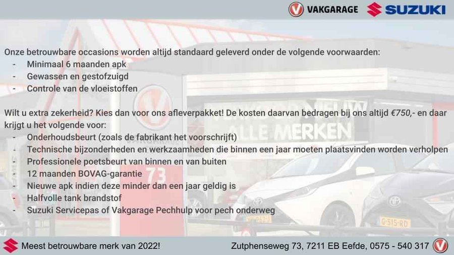 Let op: Bij elk merk tot 10 jaar garantie! Graag voor de bezichtiging van de auto bellen voor een afspraak. In verband met de drukte kunnen we op die manier voldoende tijd voor u inplannen en de auto van tevoren klaarzetten. De netto prijs bedraagt: €32.999,-. Voor de netto prijs leveren wij de auto onder de volgende voorwaarden: • Vloeistoffencontrole • Wassen en stofzuigen • APK en Leges Wilt u extra zekerheid? Kies dan voor de full service prijs, deze bedraagt: €33.650,-. Als u hiervoor kiest, leveren wij de auto af inclusief: • Onderhoudsbeurt (volgens voorgeschreven schema van fabrikant) • Technische bijzonderheden worden verholpen (banden, accu etc.) • Professionele poetsbeurt (interieur & exterieur) • Mobiliteitspas voor pech onderweg (thuis, onderweg en door heel Europa 24/7) • Halfvolle tank brandstof * Nieuwe/gebruikte winterbandenset tegen meerprijs Graag voor de bezichtiging van de auto bellen voor een afspraak. In verband met de drukte kunnen we op die manier voldoende tijd voor u inplannen en de auto van tevoren klaarzetten. Hoewel de informatie op onze website zo accuraat en actueel mogelijk wordt weergegeven, kunnen er geen rechten aan worden ontleend. Controleer daarom bij aankoop de zaken die uw beslissing zouden kunnen beïnvloeden.